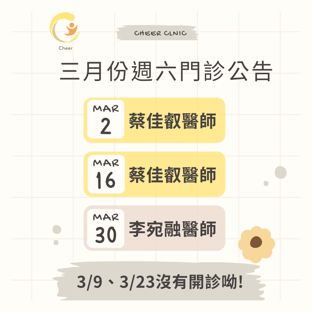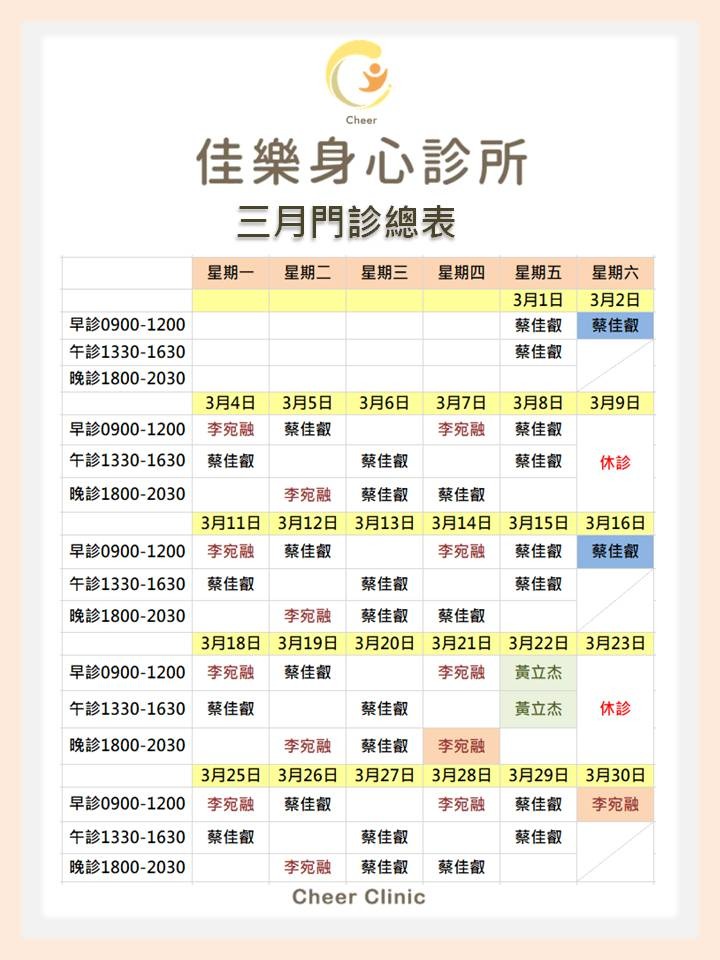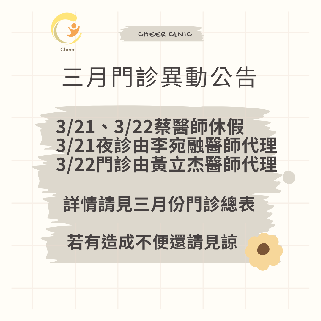 放完年假開工開學的今天,您的身心是否已經準備好要在龍年一飛衝天飛龍在天了呢?在這裡放上診所三月份的門診表給大家參考,特別提醒您,,下個月21號夜診跟22號門診看診醫師有異動歐,造成不便敬請見諒,若需要協助更改預約請多利用官方Line呦