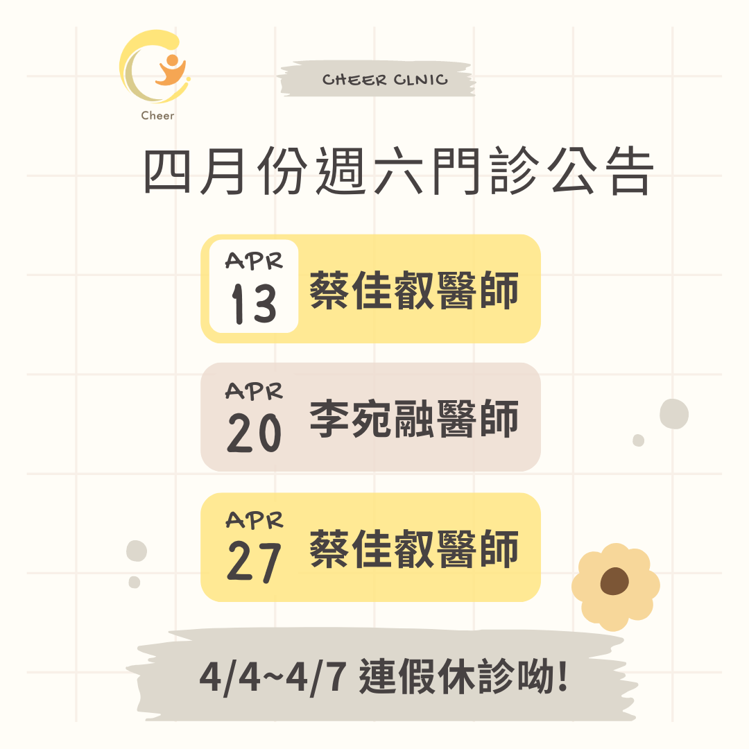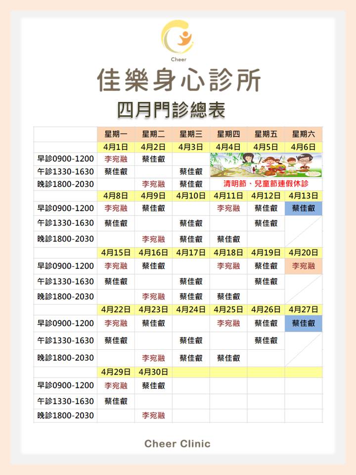 已經有捧油在敲碗下個月的門診時刻表,在這邊馬上為您放上嘍,提醒大家4/4-4/7診所休診,不要撲空呦。